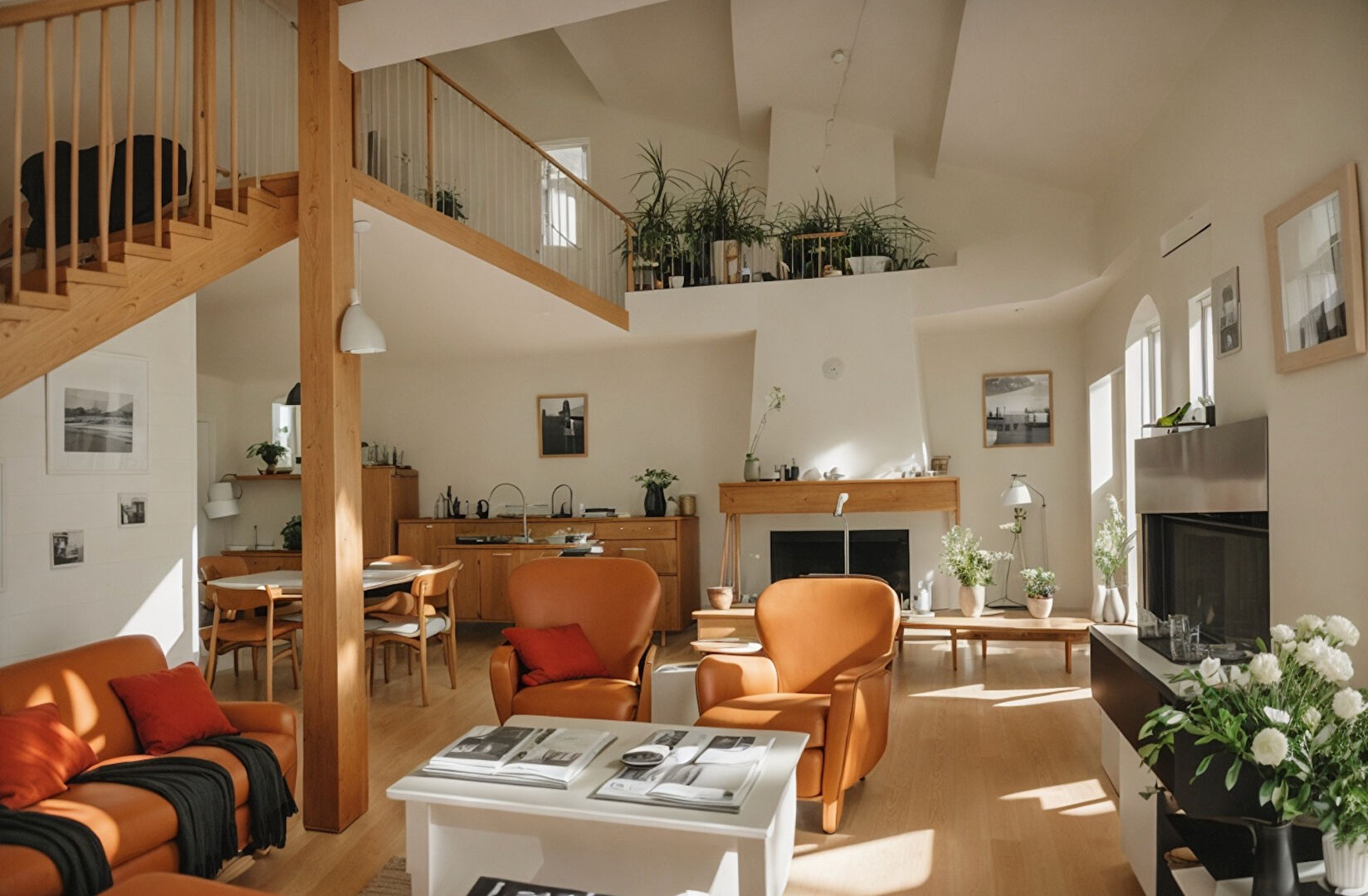 Vous découvrirez une belle pièce de vie lumineuse et traversante donnant sur le jardin, avec plafond cathédrale et mezzanine.