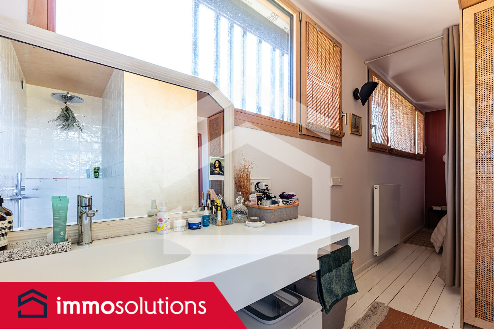 Depuis le salon, un escalier suspendu en chêne et métal laqué blanc conduit à l'étage. On y découvre un espace bureau lumineux, agrémenté d'un filet suspendu surplombant le séjour, offrant un coin de détente ludique et original. L'étage accueille également une suite parentale chaleureuse avec dressing et salle d'eau, ainsi que deux chambres nichées sous les toits, chacune équipée d'un meuble lavabo sur-mesure.