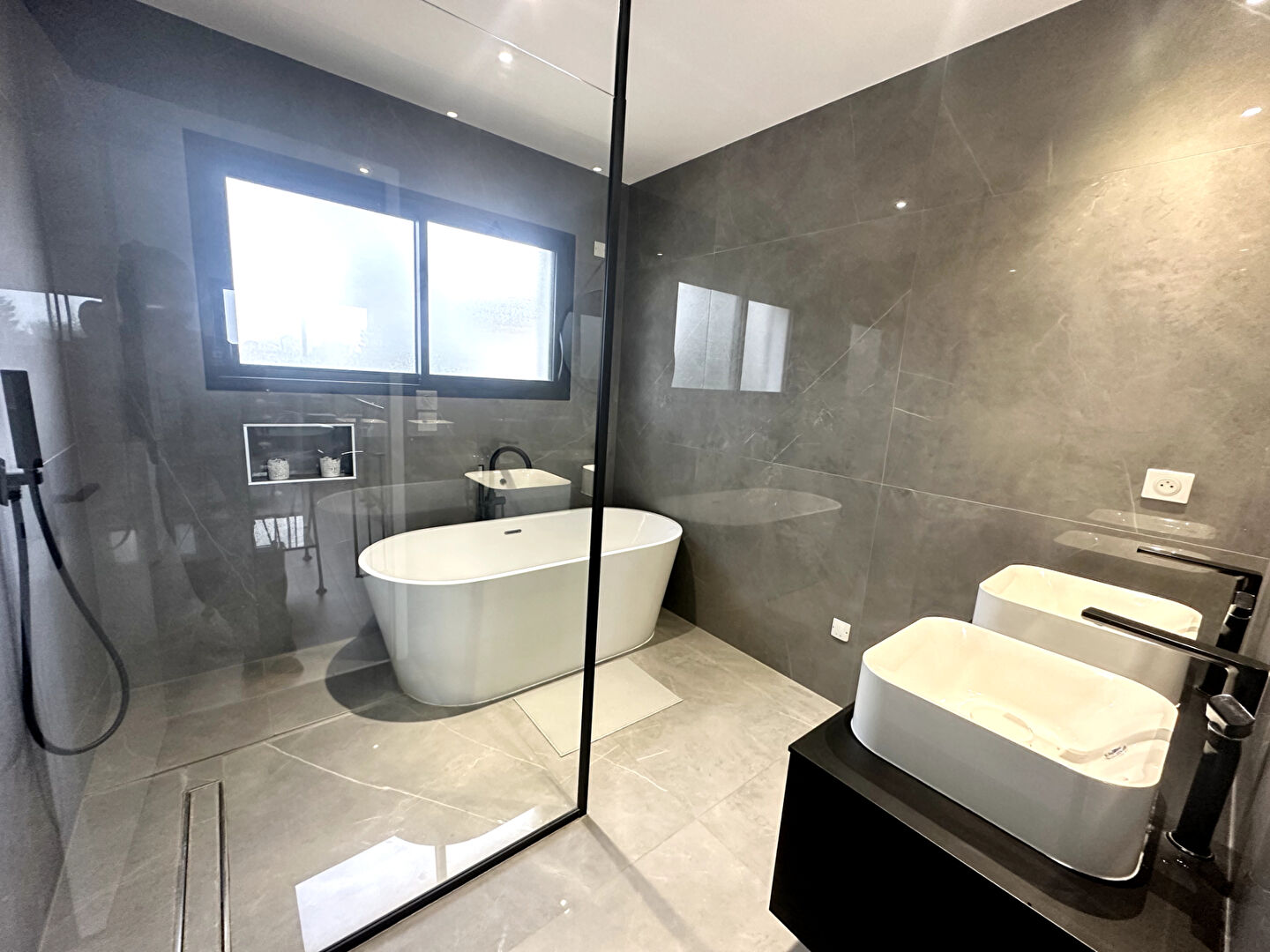 Le rez-de-chaussée comprend une suite parentale exposée ouest avec salle d'eau et dressing, un séjour double de 43 m² en double exposition donnant sur le jardin et la piscine, une cuisine équipée avec cellier, ainsi qu'un double garage de 33 m² permettant le stationnement de deux véhicules. A l'étage, deux chambres, une salle de bain et un espace bureau.