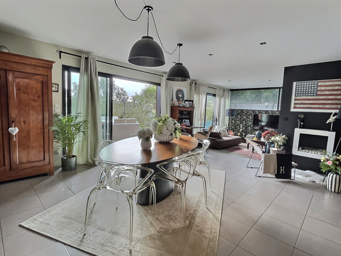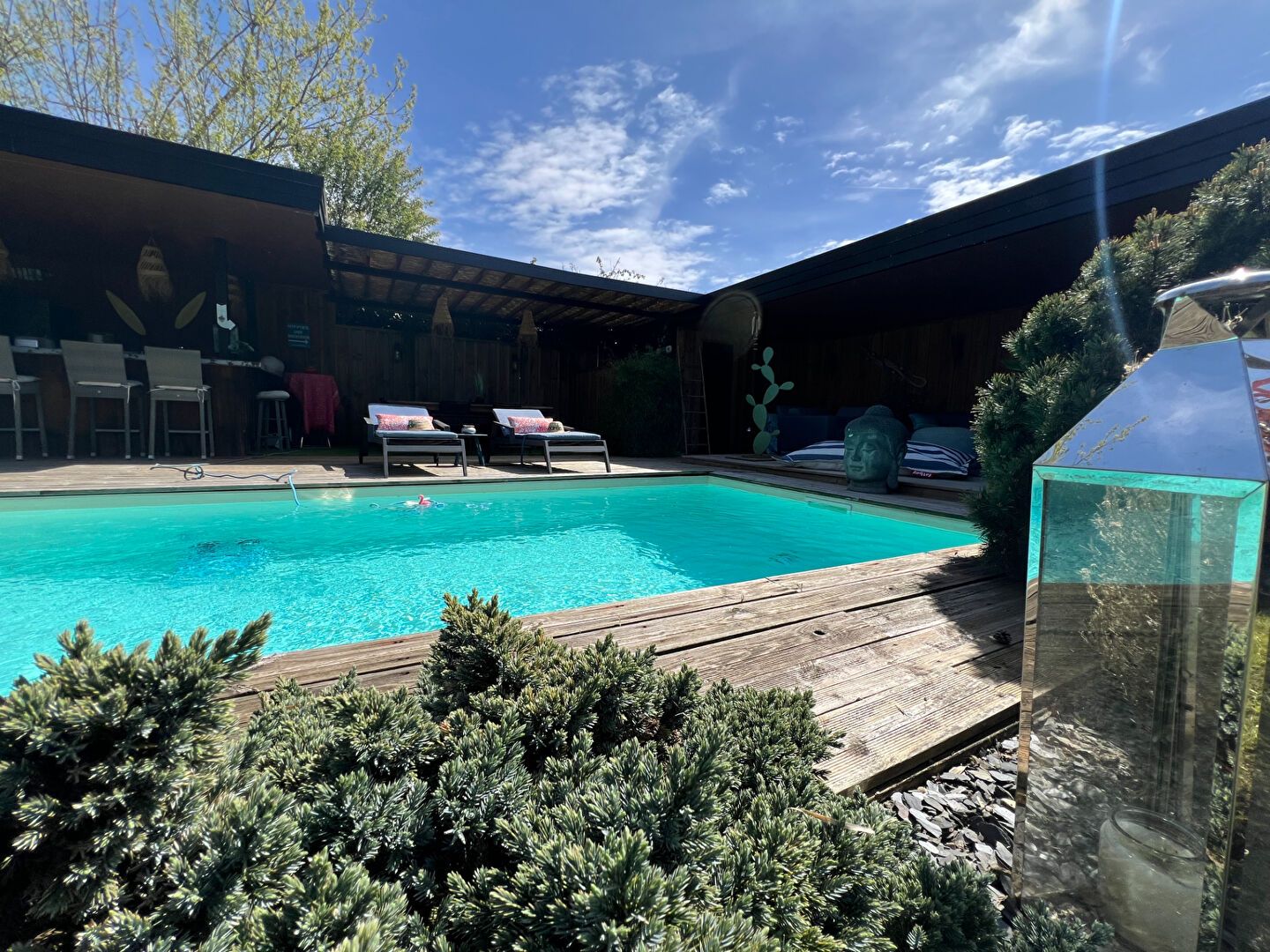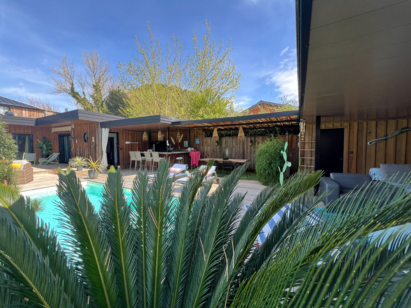 A l'extérieur, une belle terrasse, une cuisine d'été, un coin repas et un salon, le tout couvert et donnant sur la piscine et le jardin verdoyant.