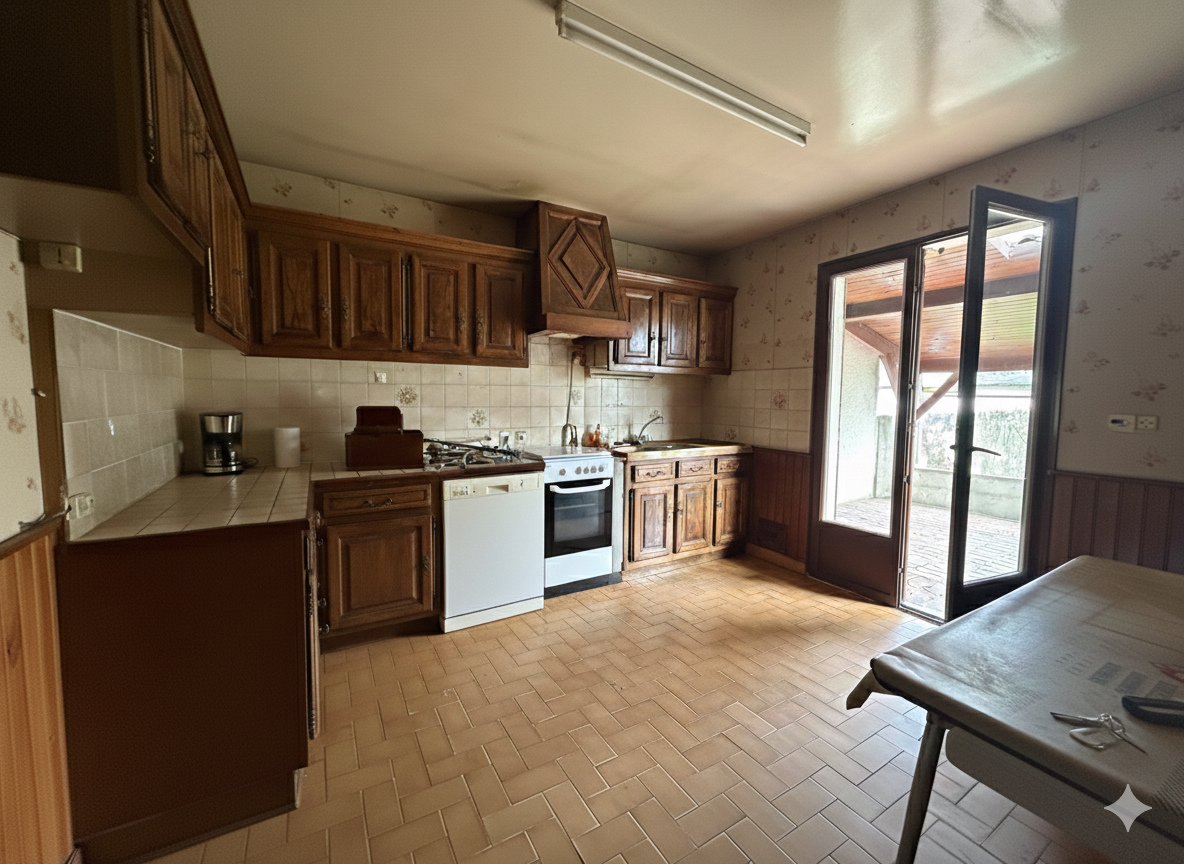 Elle se compose d'un séjour double de près de 35 m², offrant un espace convivial avec un coin salon et un coin salle à manger distincts, idéal pour recevoir. La maison dispose également d'une cuisine séparée.